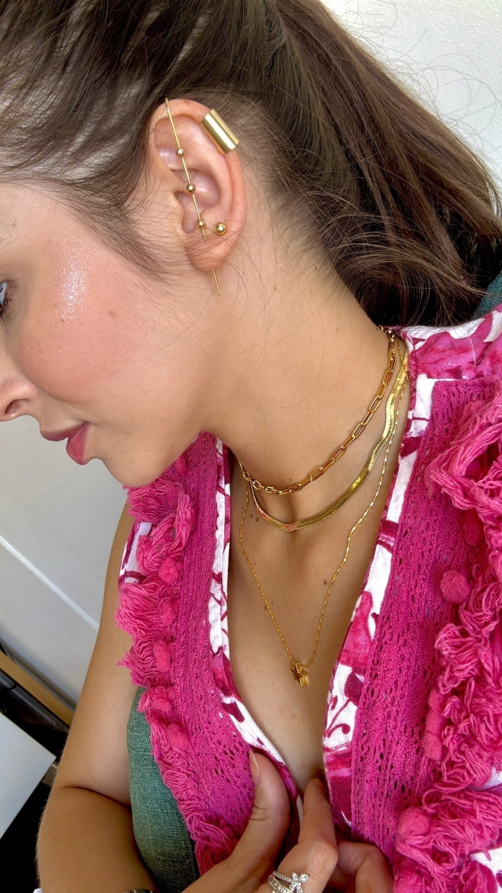A choker fita dourada folheada a ouro é uma peça elegante e sofisticada, que traz um toque contemporâneo ao estilo clássico das chokers. Suas principais características incluem: